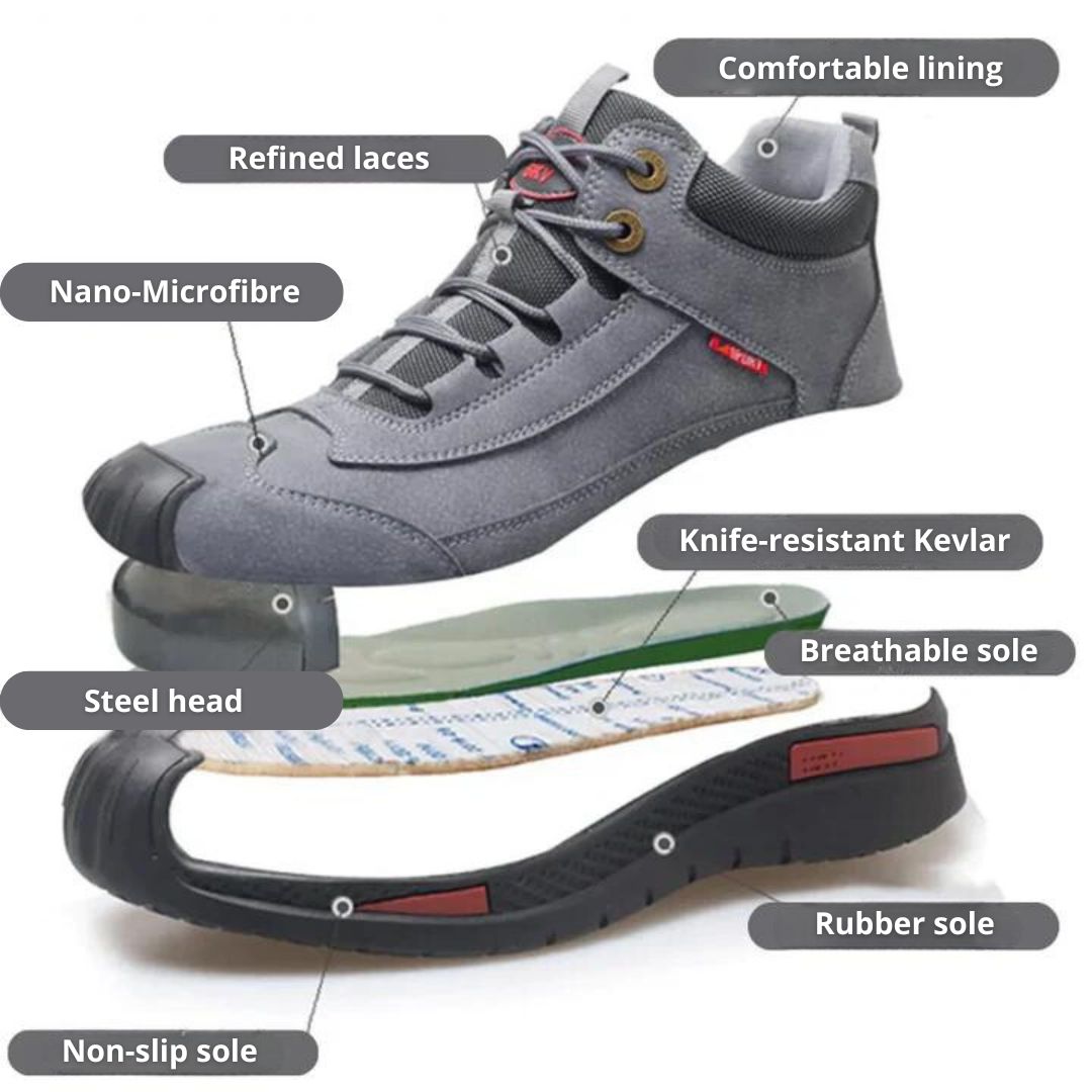 Discover the refined combination of safety and style with our Lutera safety shoes. Made from heavy steel and military-grade Kevlar , they provide unparalleled protection against workplace hazards while elevating your look to new heights.
